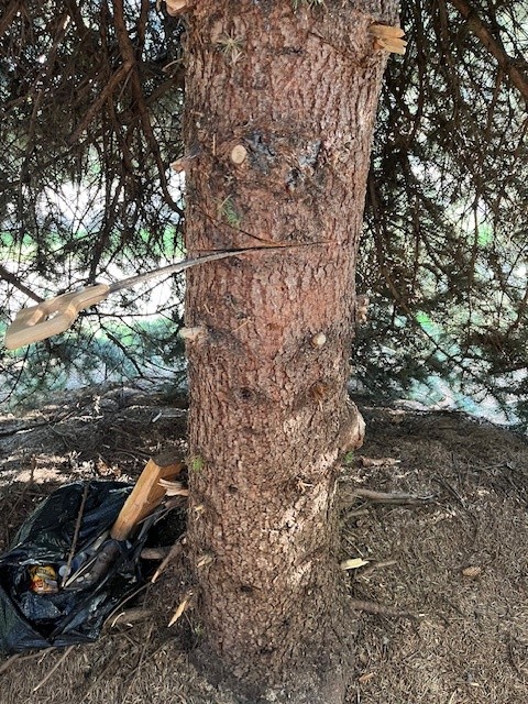 The HOA does not want to discourage outdoor activities for children, getting fresh air and exploring the great outdoors! However, it’s important to instill a sense of responsibility and respect for the environment and the property of others. The spruce tree, below, is over two decades old and has been nearly cut all the way through the trunk. The tree has been assessed by a Certified Arborist. Spruce trees, unfortunately, do not recover well from physical damage. Even if this tree survives, its structural integrity is compromised, posing a risk of toppling during severe weather. Parents, it is imperative to educate your children on the importance of respecting and preserving nature and cleaning up after themselves.